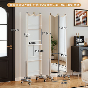 【新款皇冠穿衣镜】奶油白全身镜杂志架一体-360°可移动