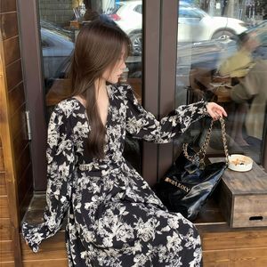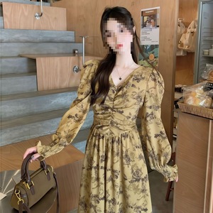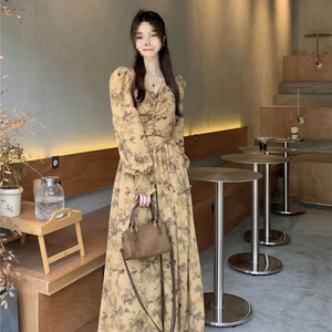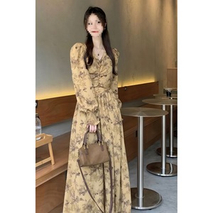 2025秋季新款高街印花长袖连衣裙简约V领通勤装