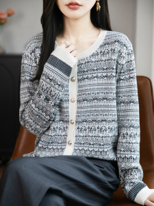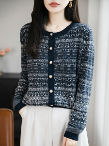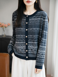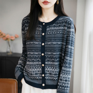 秋冬穿搭别致韩系短款毛衣外套女气质民族风提花圆领针织开衫