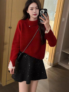 高级感温柔风灰色套头毛衣秋冬女新款蕾丝系带长袖针织打底衫上衣