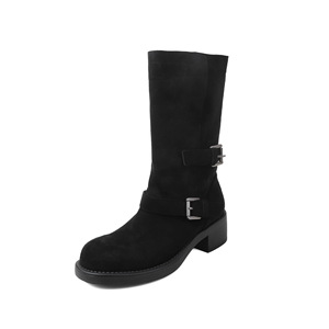 两穿可翻折皮带扣绒面西部靴2025秋冬粗跟中跟圆头厚底中筒靴子女
