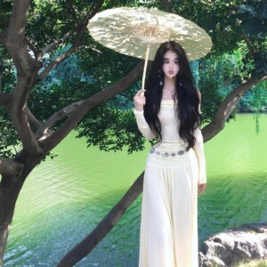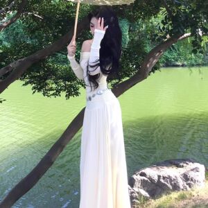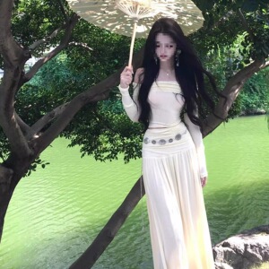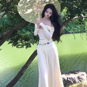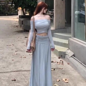 初秋新款高级感套装女装新款纯欲一字肩长袖上衣+a字半身裙两件套