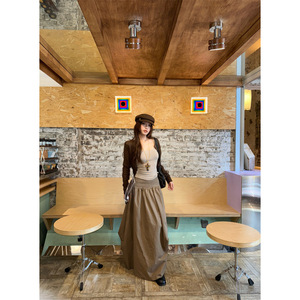 韩系辣妹镂空针织开衫复古对位捏褶宽松不对称半裙套装女