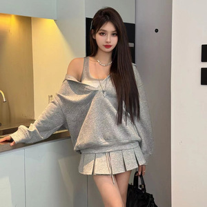 纯欲风御姐潮2025秋季新款长袖纯色连帽卫衣套装女短裙内裤三件套