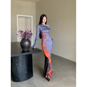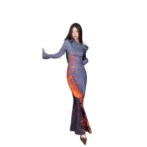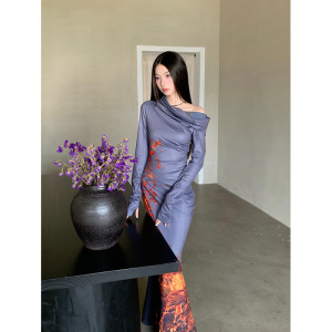 秋冬纯欲风氛围感茶歇不规则个性 印花斜肩立裁长款鱼尾裙连衣裙