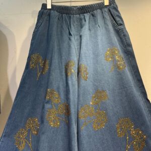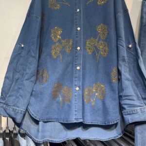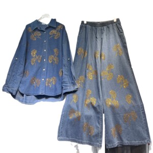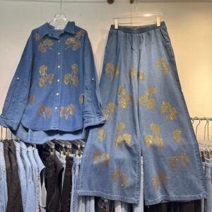 秋季新品长袖牛仔衬衫女2025欧洲站重工金色树叶烫钻设计阔腿裤