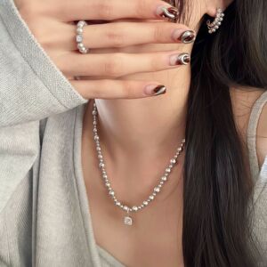 银贝真多麻灰色施家珍珠项链S925纯银秋季女毛衣链方糖锆石锁骨链