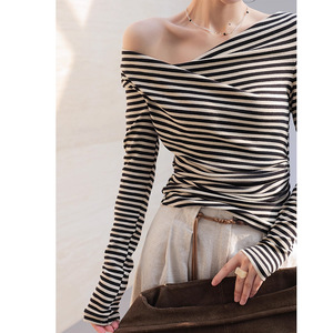 小众修身显瘦设计感条纹长袖斜肩T恤女 2025年早秋新款不规则上衣