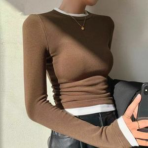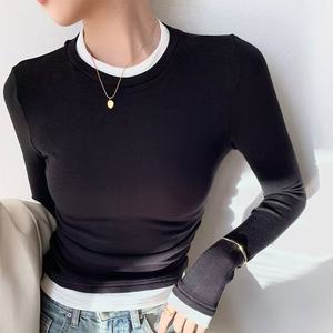 假两件长袖t恤打底衫女秋冬德绒新款叠穿撞色加绒保暖内搭上衣潮