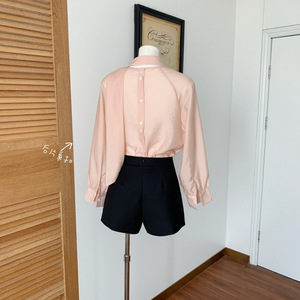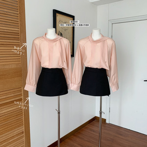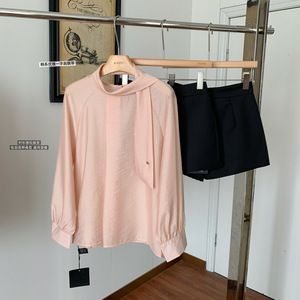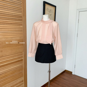 富家欧尼~韩系一字飘带领系扣粉色气质长袖衬衫女小个子