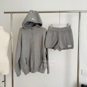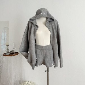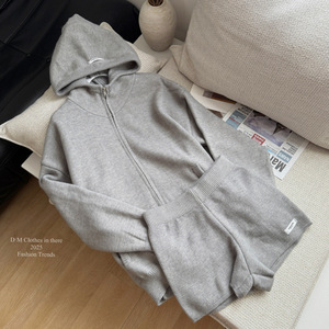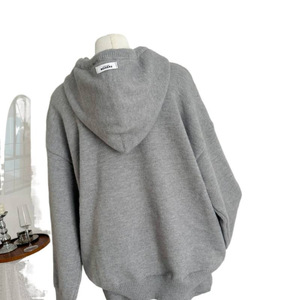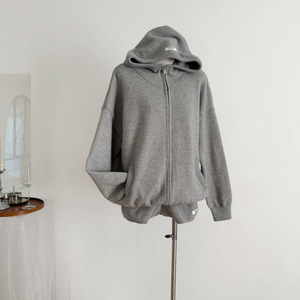 塞纳2025秋冬新款休闲灰色连帽毛衣女宽松慵懒风针织开衫拉链外套