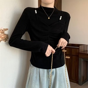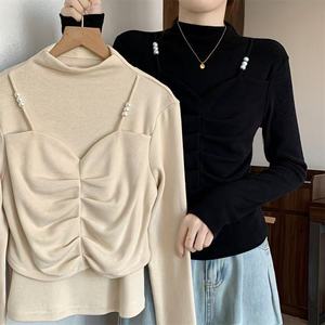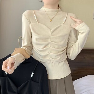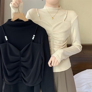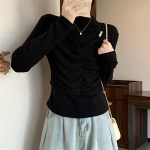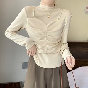 大码假两件正肩长袖t恤女秋季胖mm修身显瘦设计感半高领打底上衣