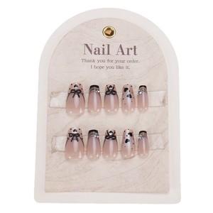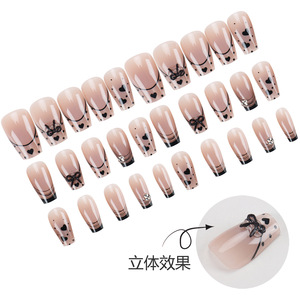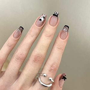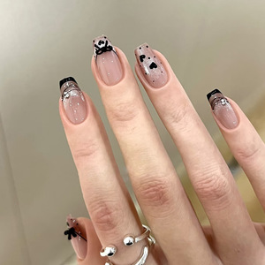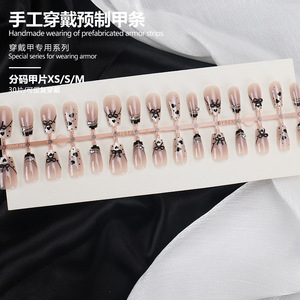 穿戴甲高级感法式短梯型黑色蝴蝶结爱心波点水钻美甲穿戴式假指甲