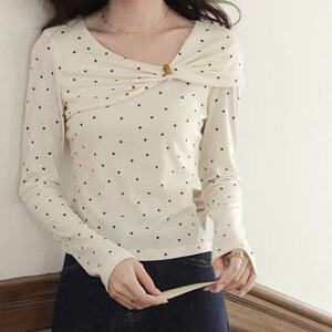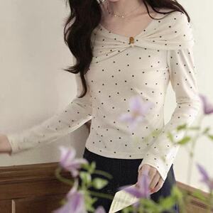 温柔杏色波点设计感修身显瘦长袖T恤女秋季扭结上衣