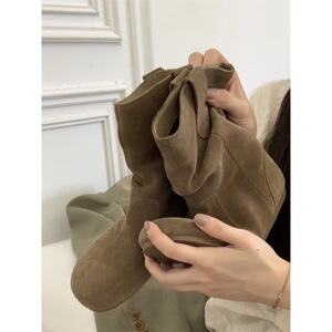 复古卡其色短靴女2025春夏新款美拉德百搭平底堆堆西部靴子