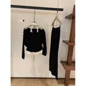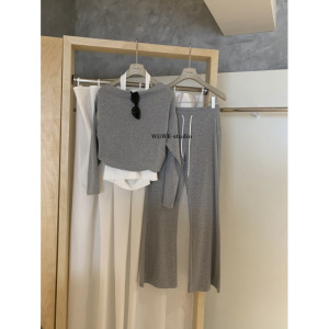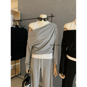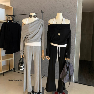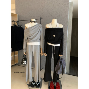 塞纳WGWE7112美式假两件一字肩挂脖长袖上衣+抽绳直筒休闲裤套装