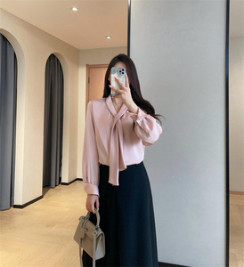 优雅轻she飘带设计垂坠丝滑缎面V领长袖衬衫女2025早秋新款