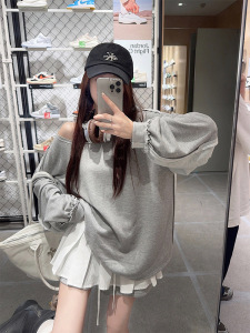 2025年灰色拼接斜肩卫衣初秋上衣+白色双层褶裙半身裙两件套装