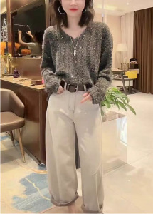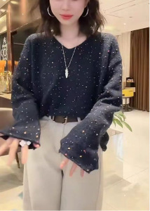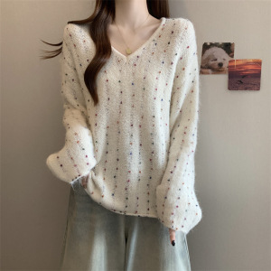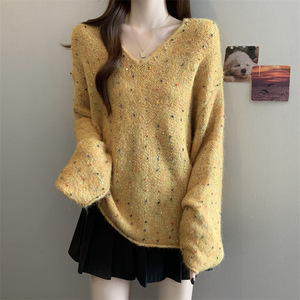 欧货亚马逊彩色V领长袖针织衫上衣女秋季宽松慵懒风软糯毛衣