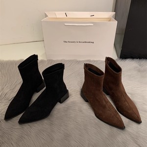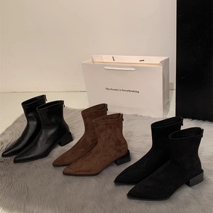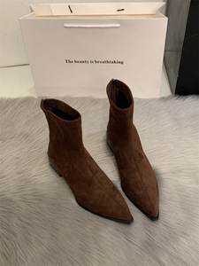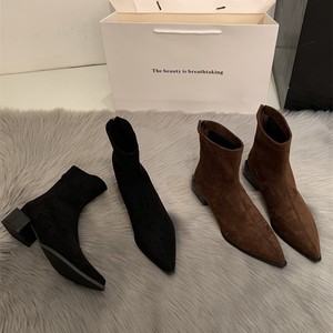 法式尖头弹力瘦瘦靴低跟2025秋冬新款粗跟短靴女复古棕色切尔西靴