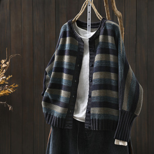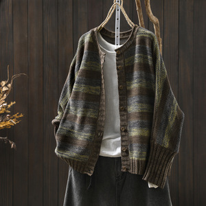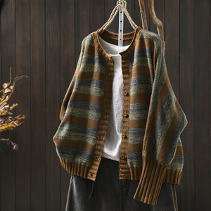 开衫针织外套女2025秋季新款文艺复古条纹拼色宽松外穿棉线针织衫