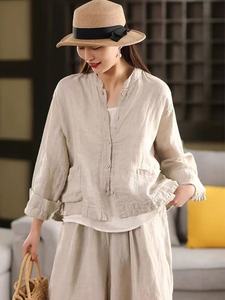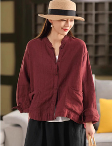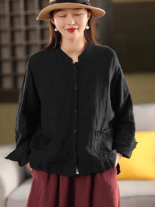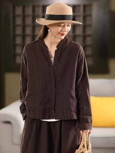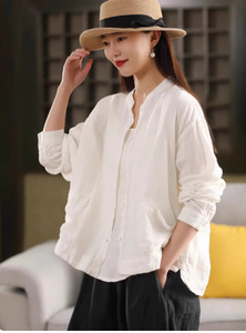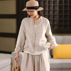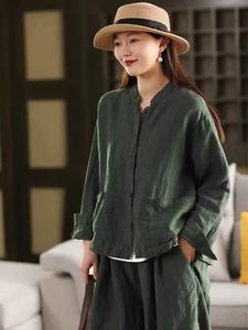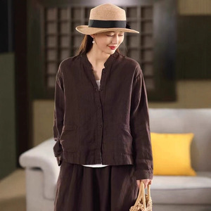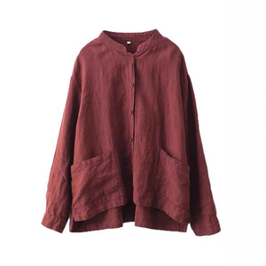 秋季新款 复古炒色亚麻长袖立领衬衫女宽松显瘦单排扣衬衣9383