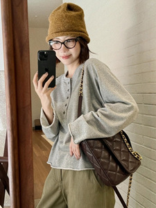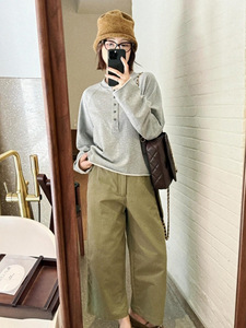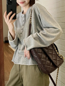 灰色卷边半纽扣设计感长袖T恤女2025新款秋季韩系穿搭慵懒风上衣