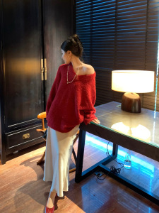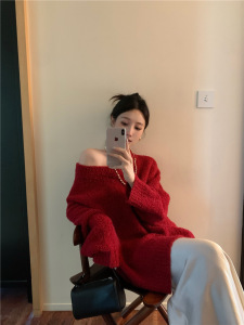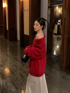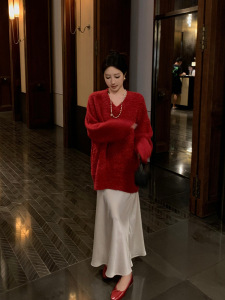 圣诞毛衣秋冬女装氛围感韩系慵懒宽松显瘦温柔红色V领针织衫上衣