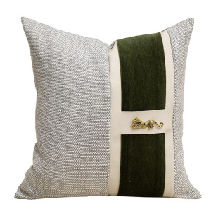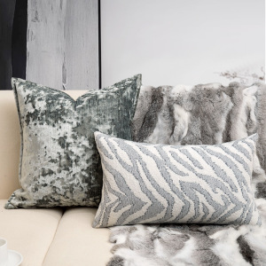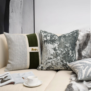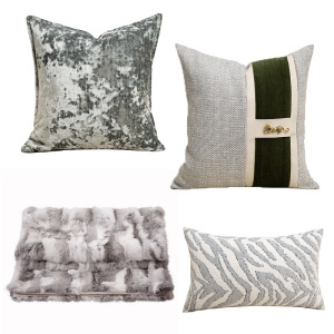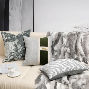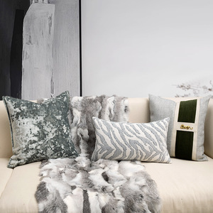 现代轻奢样板间抱枕高级感真兔毛搭毯客厅沙发灰绿色拼接靠包批发