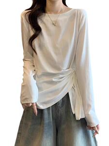 早秋2025新款不规则条纹t恤女设计感掐腰显瘦长袖上衣打底衫