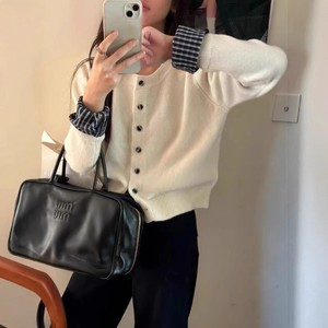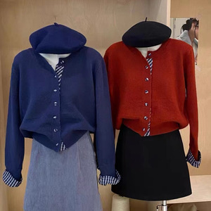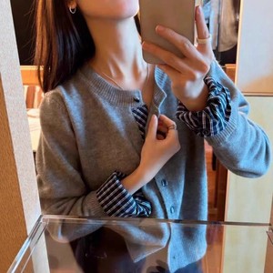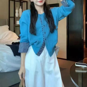 简约时尚拼接格子单排扣针织开衫上衣女秋冬别致显瘦毛衣打底外套