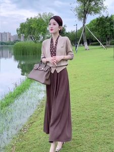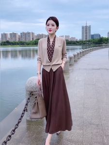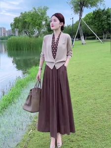 名媛风轻奢假两件针织衫秋冬新款贵妇气质半身裙套装纯色拼接印花