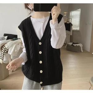 春秋开衫麻花V领单排扣小香风针织马甲开衫宽松无袖叠穿毛衣背心