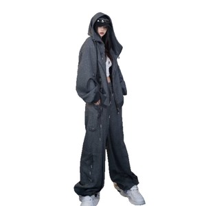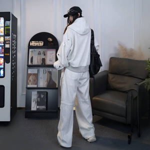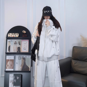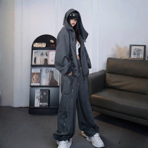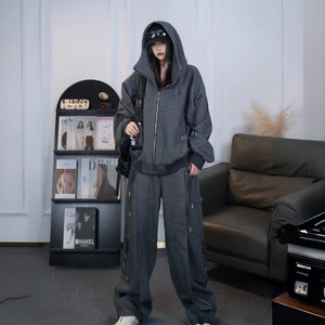 小众抽绳绑带设计感拉链连帽卫衣廓形重工休闲阔腿裤秋季套装情侣