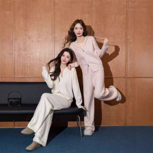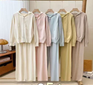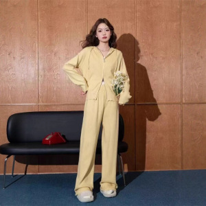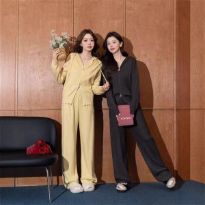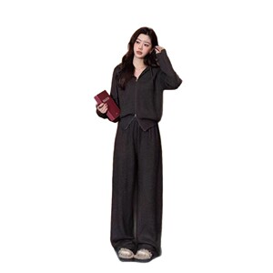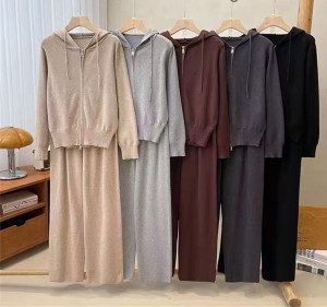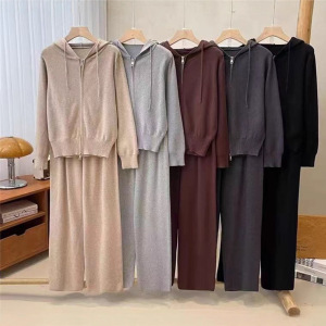 跨境新款双头拉链设计感休闲连帽开衫针织阔腿长裤两件套休闲套装