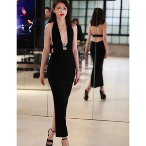现货气质优雅深V领挂脖镶钻流苏大露背后开叉包臀裙修身连衣裙长