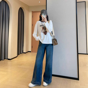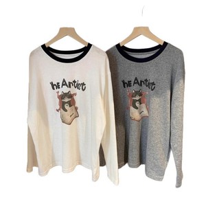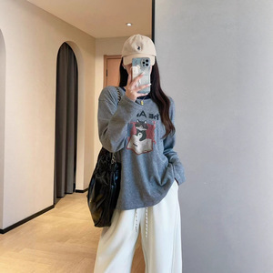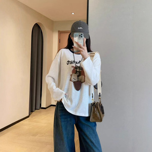 活力减龄弹力雪花棉字母小猫宽松百搭印花长袖T恤女2025秋603050