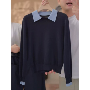 撞色翻领长袖针织衫女2025秋冬季新款显瘦百搭打底毛衣高级感上衣