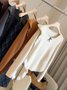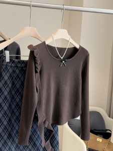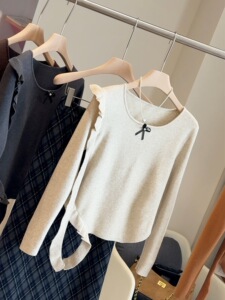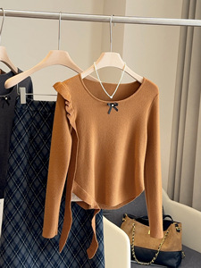 韩系荷叶边蝴蝶结修身打底针织衫女早秋2025新款收腰显瘦上衣小衫