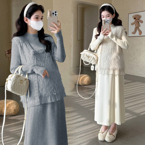 现货2025秋冬孕妇裙韩版时尚重工钩花花朵马甲+软糯打底孕妇套装