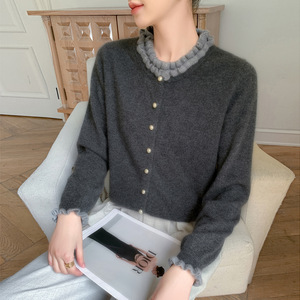 羊绒针织衫木耳花边领珍珠纽扣开衫女外套2025年新款秋冬法式毛衣