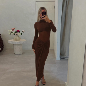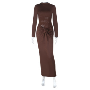 ZX25215秋季新款腰部网纱拼接长袖连衣裙女欧美跨境辣妹礼服长裙