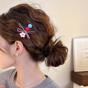 甜美红蓝花朵发夹女侧边蝴蝶结一字夹前额刘海夹子发卡鸭嘴夹头饰