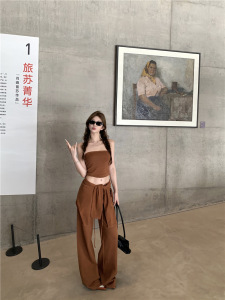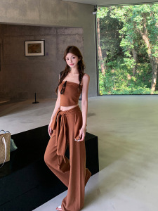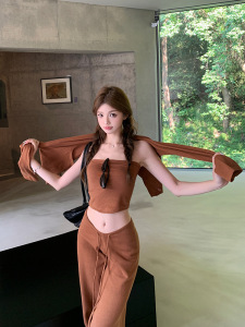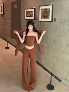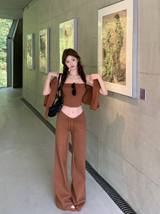 入秋女装一整套辣妹针织抹胸上衣开衫外套直筒阔腿休闲裤三件套