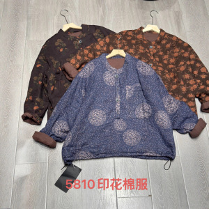 新款复古文艺宽松立领下摆抽绳保暖棉服印花棉衣女