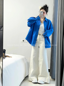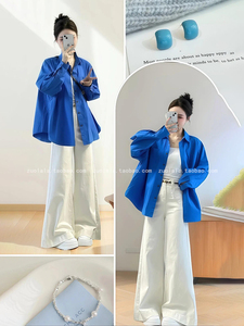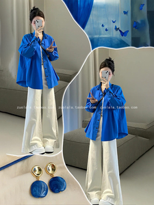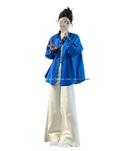 秋装搭配一整套大码胖mm克莱因蓝长袖防晒衬衫外套阔腿裤套装女