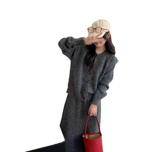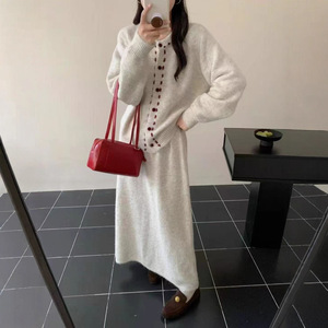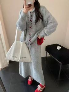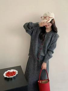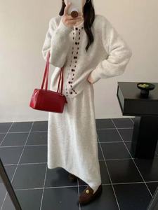 韩系秋冬新款手工穿绳圆领针织开衫针织半身长裙两件套女气质套装