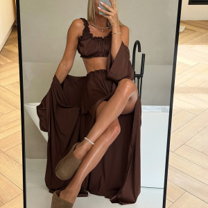 欧美跨境睡衣2025秋冬新款木耳边吊带短裤绑带开衫三件套家居服女
