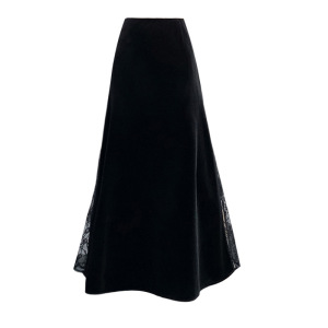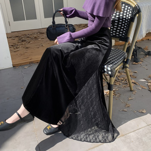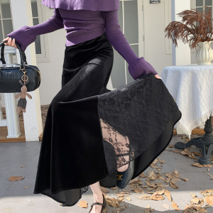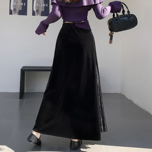 蕾丝拼接丝绒半身裙女2025秋季新款赫本风气质高腰显瘦中长a字裙