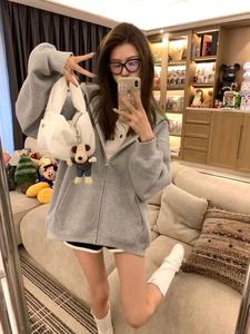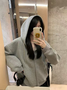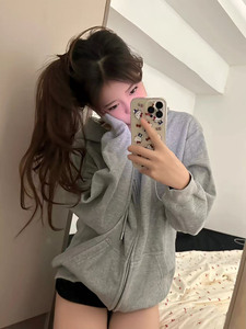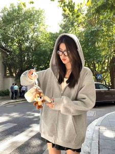 经久不衰~松弛感慵懒风2025秋冬拉链显瘦薄绒开衫 花灰色连帽卫衣